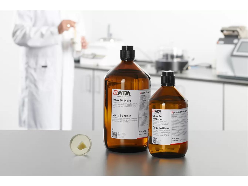 Qpox 94 is a low-viscosity and transparent two-component epoxy-based cold mounting resin, ideal for samples with delicate and complex geometries. It is particularly suitable for sensitive and porous surfaces as well as target preparations. With a curing time of about 9 hours Qpox 94 allows transparent and gap-free mounting and preparation on the same day.